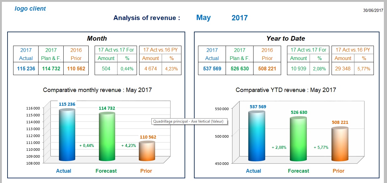 Fournir une vision synthétique des indicateurs financiers et commerciaux permettant à un gestionnaire de suivre l’évolution des résultats et les écarts par rapport à des valeurs de référence.